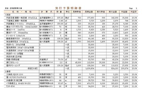 見積書作成と同時に、実行金額・利益額・利益率を自動で算出でき、実行予算書の作成も行えます。また、発注書(工事注文書・請書)の作成や原価要素別(材料費・労務費・外注費・経費)に仕分ける事も可能です。
