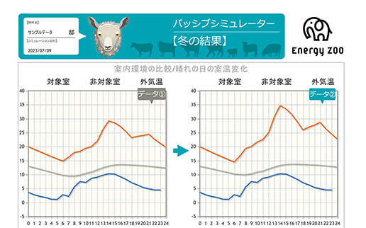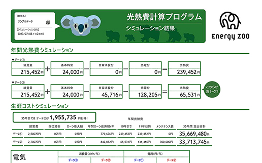 「Energy ZOO」は年間光熱費と生涯コストを算出可能。太陽光発電も考慮でき、性能の差が「円」で伝えられます。また、室温・暖冷房負荷・エネルギー消費量・光熱費がわかります。Before/Afterでの比較もでき、リフォーム・リノベーション提案にも最適です。