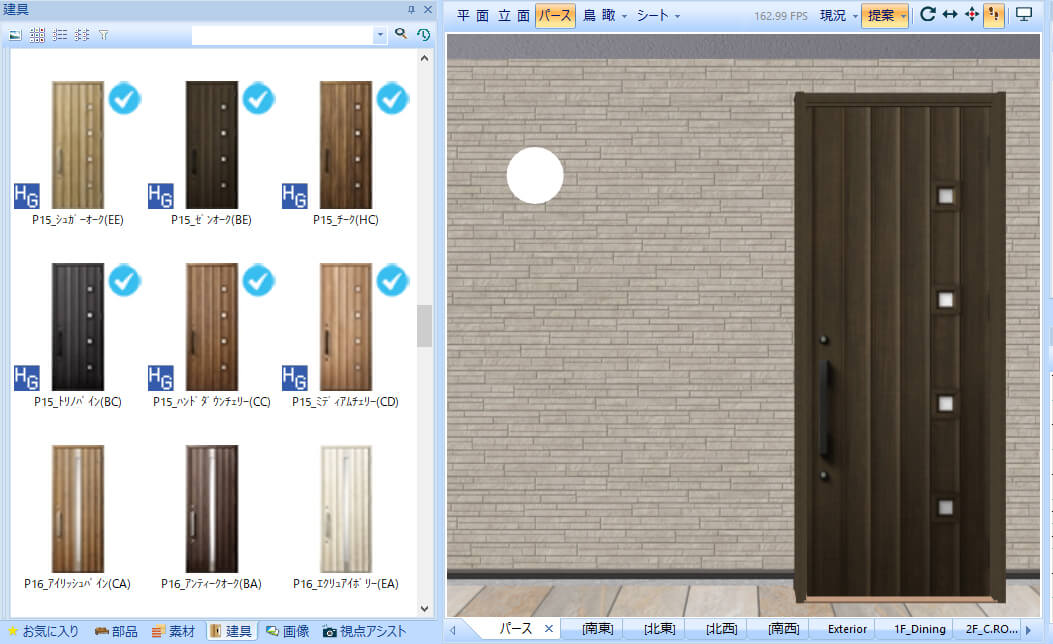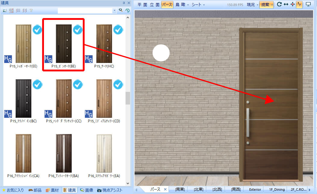 建具の入力・変更や外装の貼り分け等は、部材を選んでパース上にドラッグ&ドロップするだけで行えます。