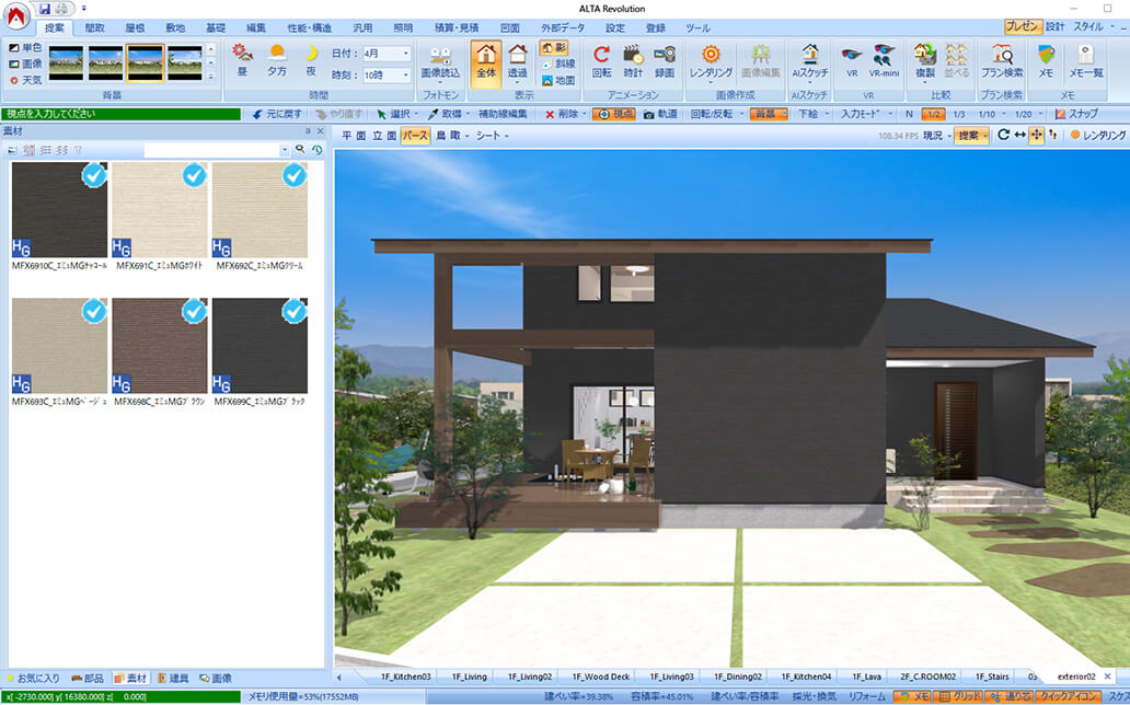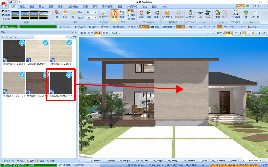 ALTAなら、内装・外装材や屋根材、床材等のテクスチャの変更や貼り分けもドラッグ&ドロップで簡単に行えます。