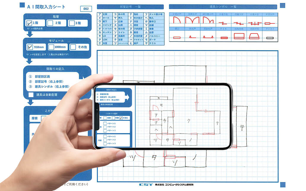 AI(人工知能)を活用する事により、専用の方眼紙に手書きした間取り図をスマートフォンで写真撮影するだけで、3Dパースに自動で変換します。