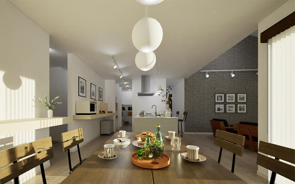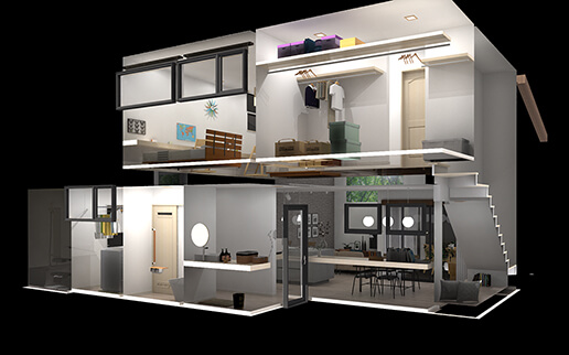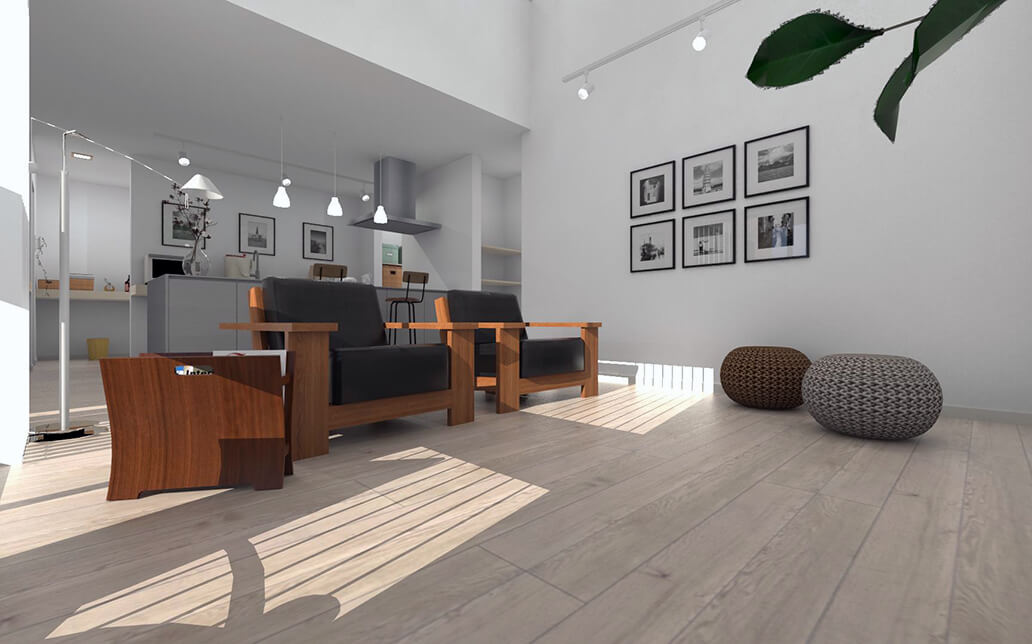 ラジオシティは、1画像ずつレンダリングを実行し、画像品質の向上を図る従来の方式と異なり、住宅空間全体で計算する事ができますので、動画生成時の画像品質が向上します。