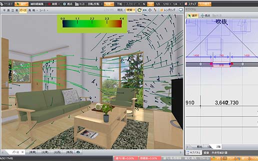 流体解析のエンジンを利用して、建物内部の風の流れをシミュレーション。風通しの良い住宅提案が可能となります。