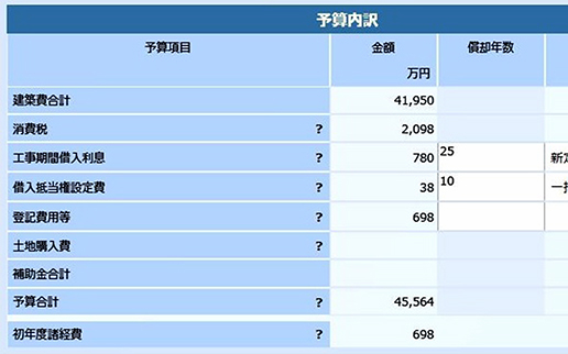 償却年数・借入抵当権設定費などの確認が行えます。