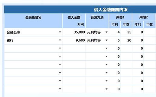 借入機関毎に借入金額・期間を入力し、返済方式を「元利均等」「元金均等」「ステップ」から選択できます。