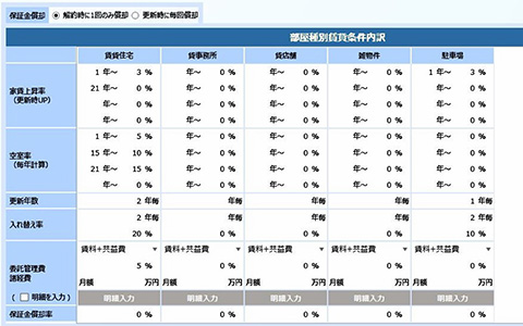 家賃上昇率や将来にわたる空室率、税務・税金条件、運用条件などを設定することで、現実味のある長期的な収支計画が作成できます。