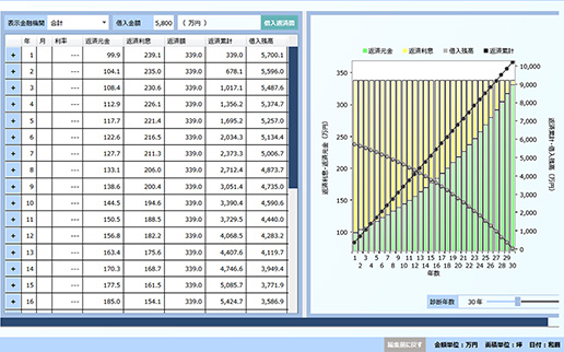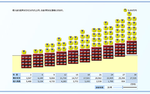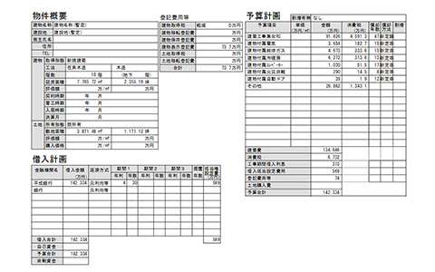「建築費」「自己資金」「返済方式」「税務条件」等の条件を変更したり、「マンション」「駐車場」等に建物用途を変更した複数プランを比較シミュレーションする事が可能です。