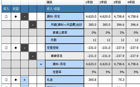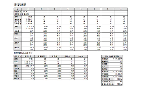 | 帳票 | 物件概要・予算計画・借入計画 / 賃貸計画 / 賃貸条件・税務条件 / 運用条件・税金等条件 / 収支一覧表 / 収支累計表 / 損益推移表 / 財産状態図 / 借入金返済表 / 比較条件一覧表 / 比較収支一覧表 / 収支累計比較図 / 収支損益比較図 / 納税額比較図 / 税率表 |
