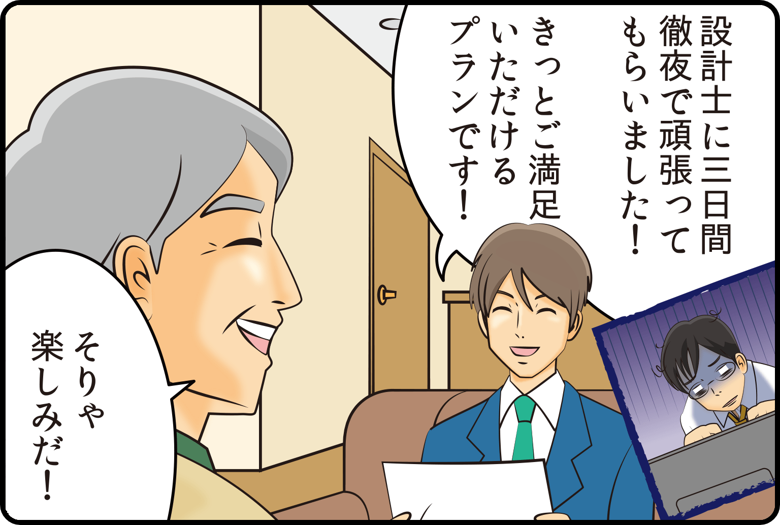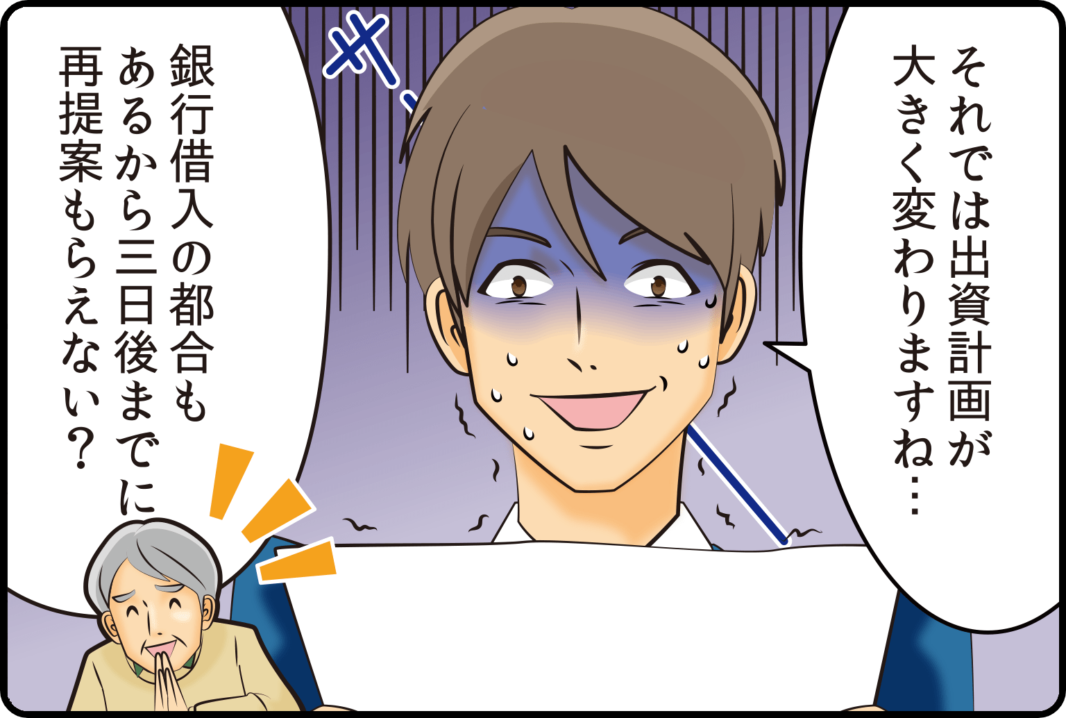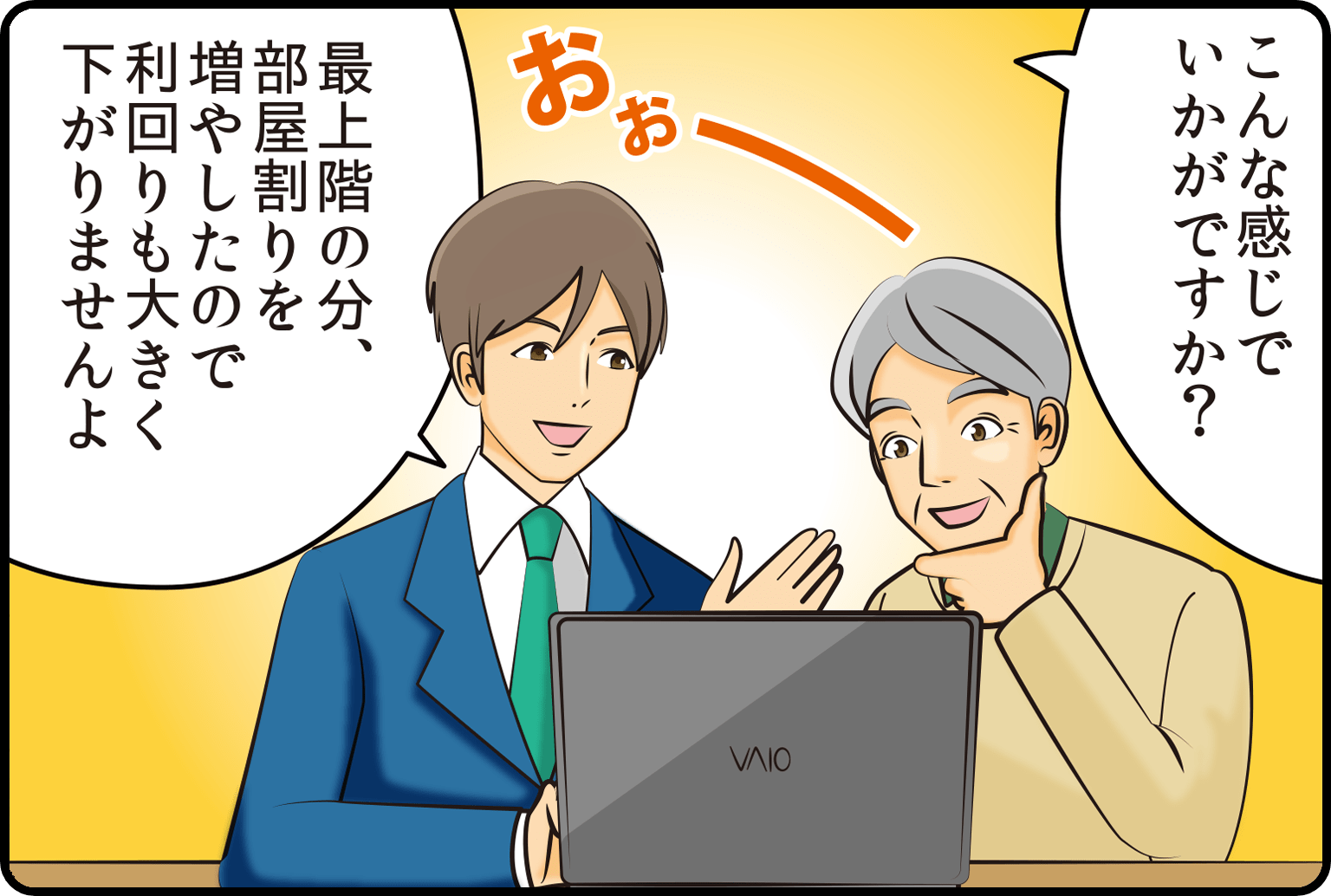 オーナーズVisionなら、オーナーの急な要望に対してその場で修正が行えます。 「オーナーズVision」はオーナーの要望を聞きながら、簡単操作でプランの修正が行えます。提案にかかる日数を大幅に短縮することが可能です。 「プラン入力機能」の詳細を見る 「収支計算機能」の詳細を見る