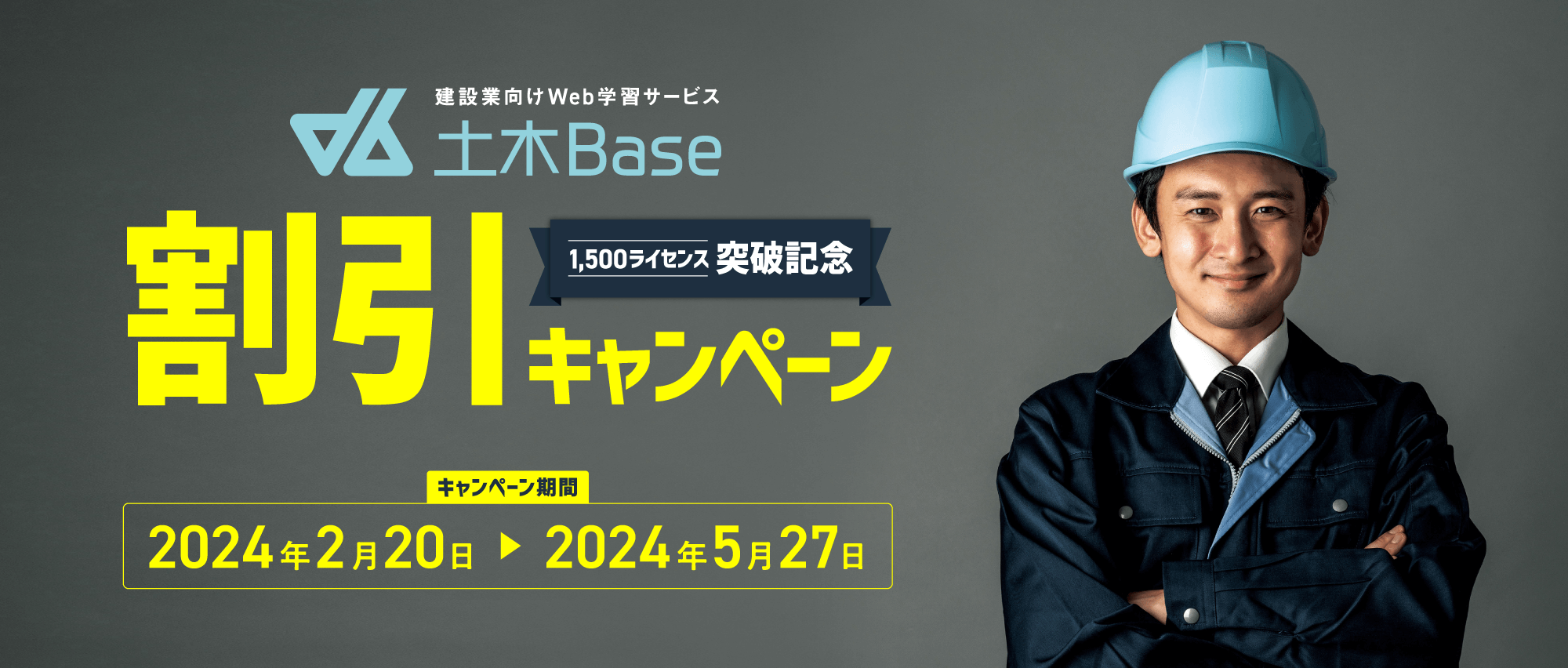 キャンペーン期間内に建設業向けWeb学習サービス「土木Base」を新規ご契約いただいたお客様(土木積算システム「ATLUS」ユーザー様を除く)を対象に年間会員料金(5ライセンス合計)を特別料金にてご提供いたします。