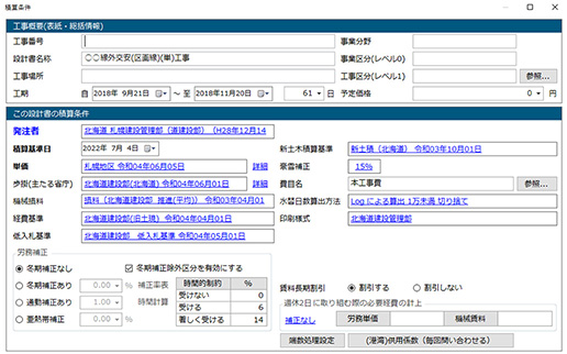 設計書データ(PDF・Excel等)をドラッグ&ドロップで取り込み、設計書の工事名や積算条件(単価地区・経費条件)を自動設定し内訳書を作成します。