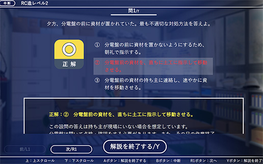 バーチャル現場で一定の経験を積むと、探索している現場に関連したテキストや画像問題が連続で15問出題されるドリルを用意しています。