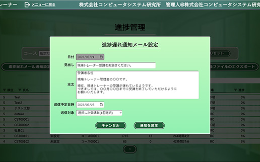 管理者は進捗が遅れている受講者に対して「進捗遅れ通知メール」を送信し、受講を促す事ができます。