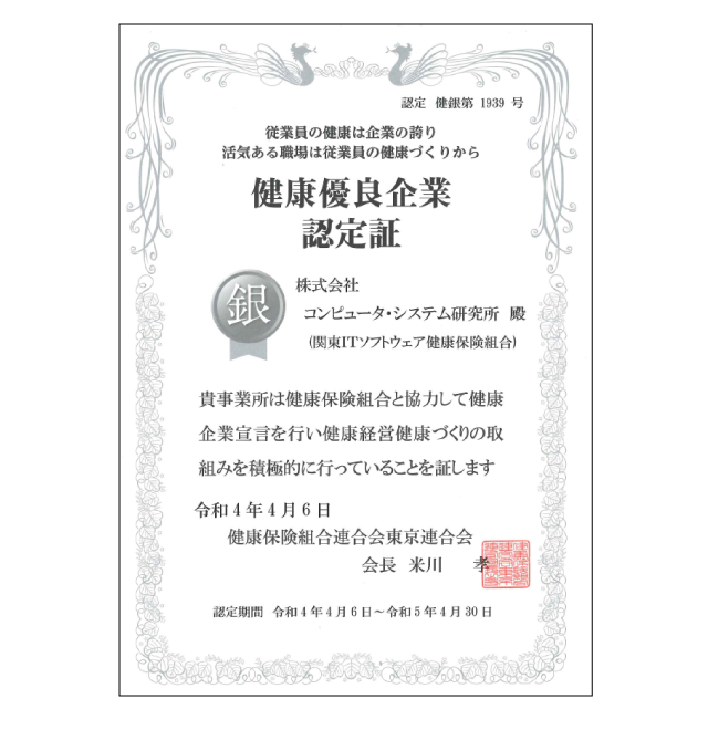 株式会社コンピュータシステム研究所(本社:仙台市青葉区、代表取締役:長尾良幸)は、健康保険組合連合会東京連合会などが運営する「健康企業宣言制度」に参加し以下、健康経営づくりの取り組みを実施し、2022年4月6日付で「健康優良企業 銀の認定」を取得いたしました。